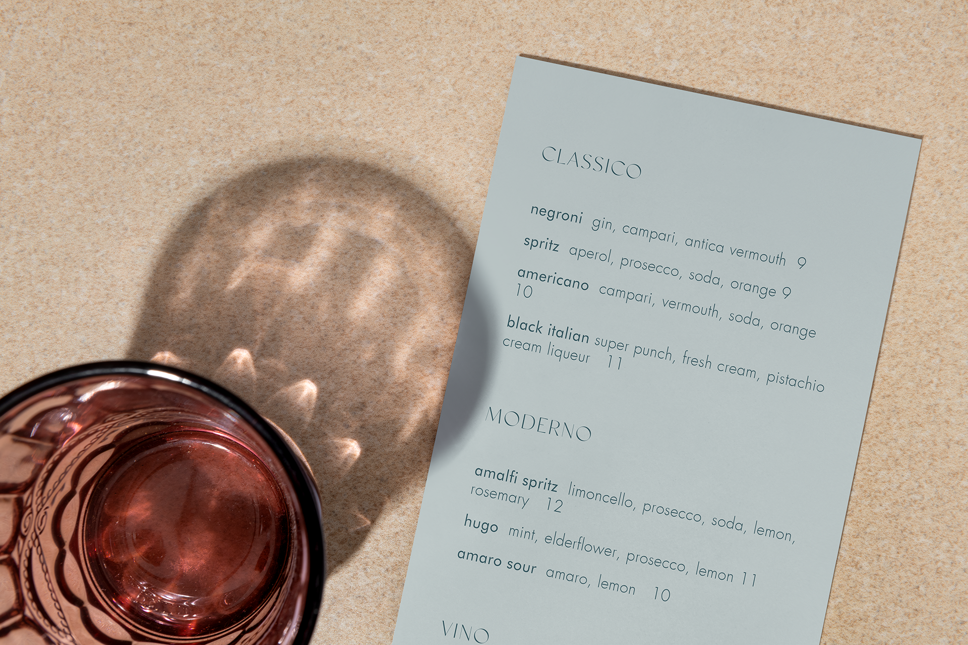 The design system was built to reflect this world. A primary logotype accompanied by two secondary marks creates flexibility across touchpoints, while a restrained palette and refined typography bring a sense of calm and cohesion. Menus, business cards, and brand collateral were designed with a lightness and fluidity—echoing the gentle pace of long lunches, ocean air, and evenings that unfold without urgency.