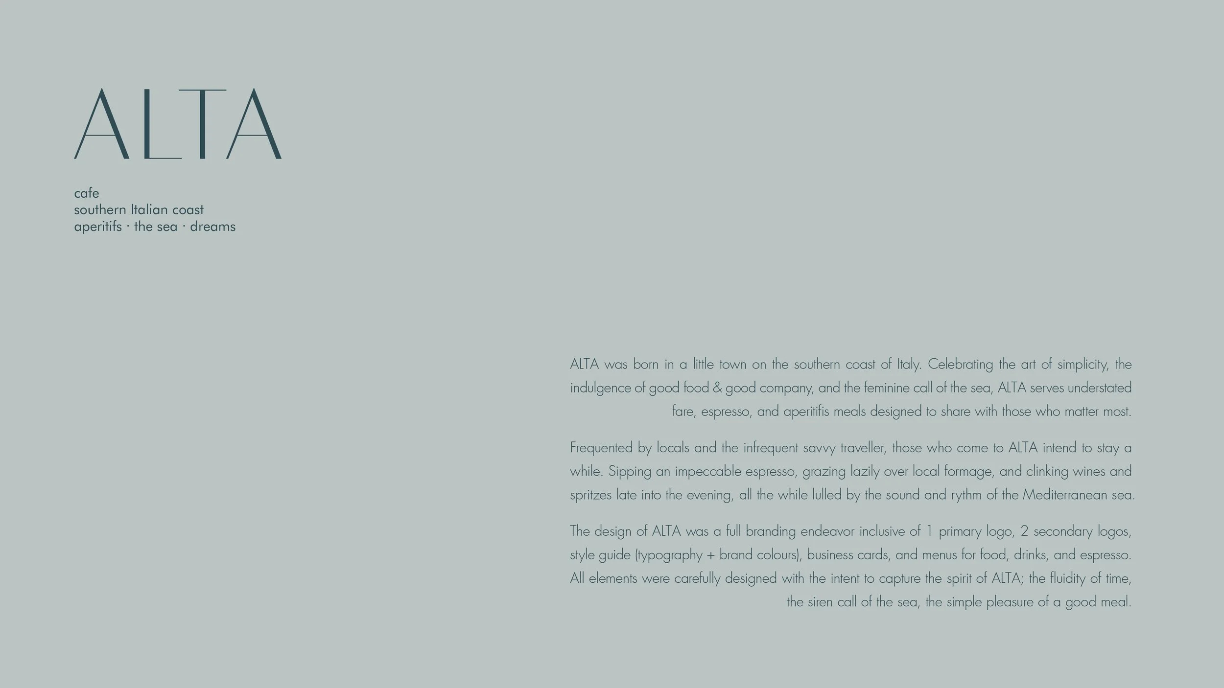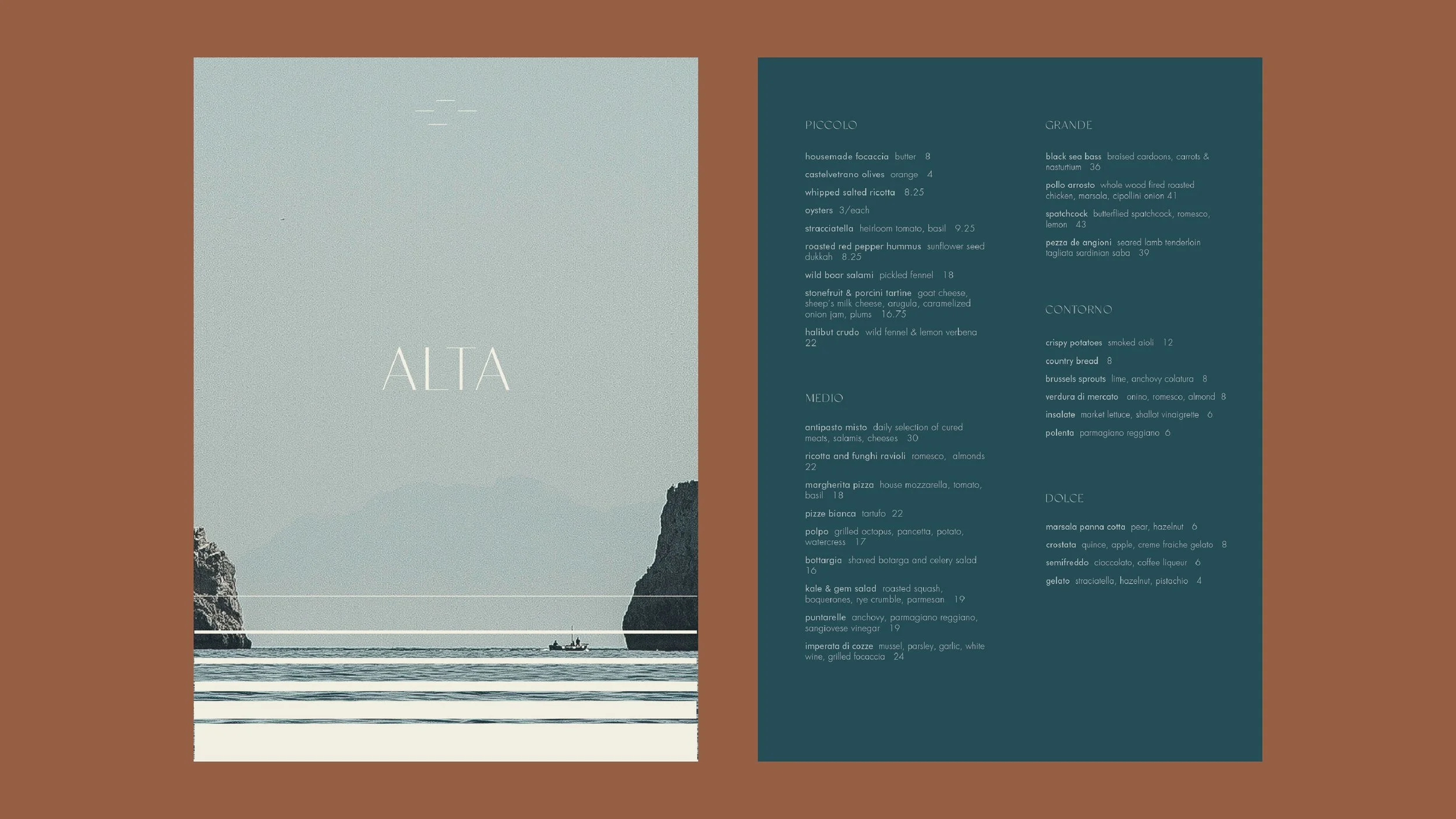 ALTA was born in a small town on the southern coast of Italy—where time softens, meals stretch long into the evening, and life revolves around good food, good company, and the rhythm of the sea. Serving understated fare, espresso, and aperitifs designed to share, ALTA captures a feeling as much as a place—intimate, feminine, and quietly indulgent.